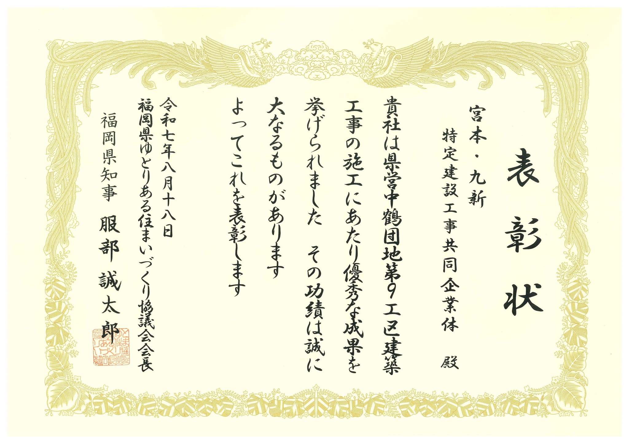 一覧へ戻る 弊社施工(JV)の建築工事が優秀表彰を受賞しました2025-08-27注目建設工事 この度、福岡県ゆとりある住まいづくり協議会様より『県営中鶴団地第9工区建築工事』の表彰状をいただきました。これもひとえにJVの九新建設様をはじめとして、多くの工事関係者様のご尽力のおかげであります。社員一同心から御礼申し上げます。
